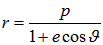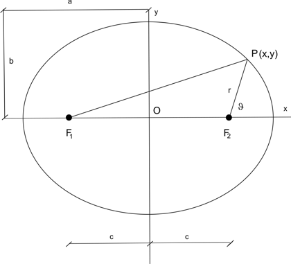 Wyprowadź poniższe równanie elipsy zapisane we współrzędnych biegunowych, których początek umieszczony jest w jednym z ognisk elipsy:
