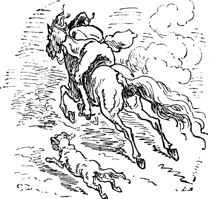 Ĉasante iutage leporon, kiu ŝajnis al mi neordinare granda, mi simpatiis kun mia kompatinda hundino, kiu estis graveda, kaj tamen ĉasis rapide kiel ĉiam. Mi mem povis sekvi surĉevale nur en granda distanco. Subite mi ekaŭdis bruon kvazaŭ venanta de aro da hundoj, tamen ĝi estis tiel malforta kaj malklara, ke mi ne sciis la kaŭzon.