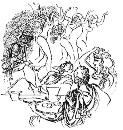 La granda venkanto duonkuŝis, ĉirkaŭita de siaj proksimuloj, ebriaj kaj arogantaj. Nur Nearĥo kaj Leontisko eksidis iom malproksime, aŭskultante bonegan tinosan kantistinon. Alta, en nigra, kiel nokto, peplo, ŝi similis al Hekato. Nur anstataŭ la mornaj hundoj, akompanantaj la diinon, du gajaj, tradicie nudaj flutistinoj akompanis ŝian malaltan voĉon, al kies forto povus envii militestroj. Vasta disfluo de la kanto portis konsolon, forlavante, kiel maro, homajn ĉagrenojn, ordonante esti pli trankvila, atenta kaj bonkora.