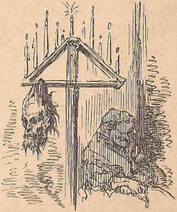 Kvar rabistoj komencis fosi tombon meze de la ĉambro, sur la loko de la tendo de Sino Simons, tie, kie Mary-Ann estis dorminta. Du aliaj kuris al la tenejo por preni kandelegojn, kiujn ili disdonis al la ĉeestantaro. Mi ricevis unu; kiel ĉiuj. La monaĥo ekkantis la Diservon por la mortintoj. Haĝi-Stavros psalmodiris la respondojn per firma voĉo, kiu tuŝis min ĝis en la fundo de l’ animo. Venteto blovis, kaj la vakso de mia kandelego falis sur mian manon kiel bruliga pluvo; sed tio estis, ho ve! tre malmulte, kompare kun tio, kio min atendis. Mi estus volonte aboninta tiun ĉi doloron, se estus eble, ke la ceremonio neniam finiĝos.