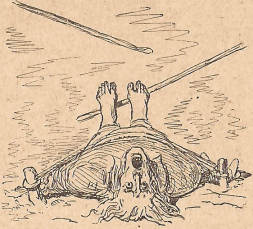 La bastono vane falis. La lastaj frapoj trafis sangokovritan, sed sensentan materion. La doloro estis preskaŭ paralizinta min.