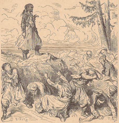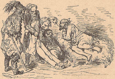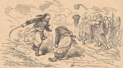 – Iru ĉiuj al la diablo! diris la Reĝo. Vi rezonus malpli kviete, se la malnoblulo estus ŝtelinta de vi okdek mil frankojn! Forportu lin en la tendaron, kaj amuzu vin per li. Sed ve al la mallertulo, kiu mortigus lin pro nesingardo! Tiu ĉi homo devas morti nur per mia mano. Mi volas, ke li repagu al mi per plezuro ĉion, kion li forprenis de mi permone. Li verŝos gutope la sangon de siaj vejnoj, kiel malbona ŝuldanto, kiu elpagas soldope.»