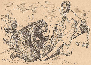 Li forsendis el la ĉambro ĉiujn rabistojn, kiuj amasiĝis ĉirkaŭ ni. Li malligis zorgatente la sangomakulitajn tolaĵojn, kiuj kovris miajn vundojn. Li sendis sian ĉibuĝi por la ŝmiraĵo de Luiĝi-Bej. Li sidiĝis antaŭ mi sur la malsekan herbon, prenis miajn piedojn en siajn manojn kaj rigardadis miajn vundojn. Nekredebla fakto: li havis larmojn en la okuloj!