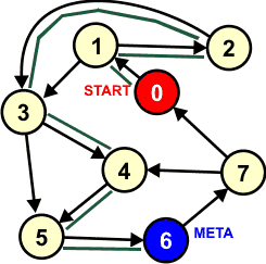 Osiągnęliśmy wierzchołek docelowy. Zatem istnieje w tym grafie ścieżka od wierzchołka 0 do 6. Algorytm DFS zawsze nam taką ścieżkę znajdzie. Nie gwarantuje on nam natomiast, że będzie to najkrótsza możliwa ścieżka. |
