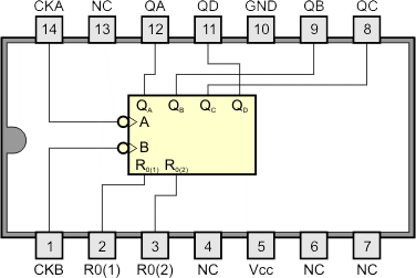 Aby uzyskać licznik 4 bitowy, należy wyjście QA (z licznika 1 bitowego) połączyć z wejściem CKB (wejście zegarowe licznika 3 bitowego). Zliczane impulsy należy podawać na wejście CKA.