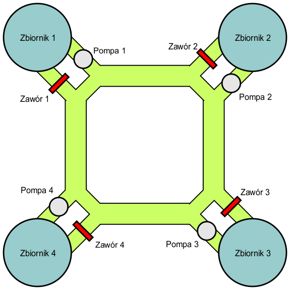 Pewna fabryka chemiczna posiada cztery zbiorniki połączone ze sobą w sposób pokazany na rysunku. Przy każdym zbiorniku znajduje się zawór kontrolujący przepływ cieczy do zbiornika oraz pompa kontrolująca wypływ. Komputer sterujący procesem kontroluje zawory i pompy, otrzymując swoje dane wejściowe z konsoli operatora i z czujników w zbiornikach. Masz za zadanie napisać program, który będzie symulował transport płynów pomiędzy zbiornikami wg poniższego opisu.