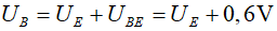 W układzie elektronicznym należy również zadbać, aby napięcie baza-emiter nie przekraczało wartości 0,6...0,8V. Jest to napięcie przewodzenia złącza p-n baza-emiter. Przekroczenie tej wartości powoduje duży wzrost prądu bazy. Napięcie to ma tendencję do samoregulacji, czyli ustala się automatycznie na odpowiednim poziomie. Wynika z tego, że: