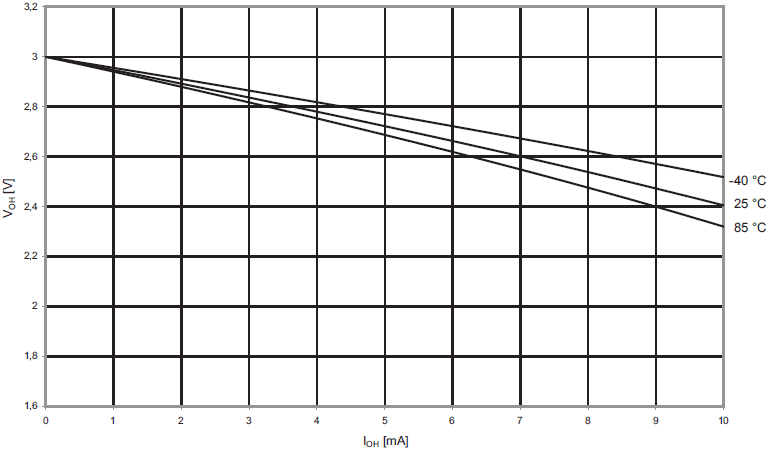 VOH: napięcie wyjściowe w funkcji prądu wypływającego z końcówki