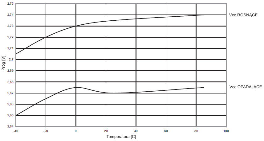Próg BOD w funkcji temperatury (BODLEVEL wynosi 2,7V)