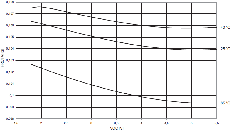 Kolejne wykresy pokazują typowe zachowanie się układu. Parametry te nie są testowane podczas produkcji, gdzie testy wykonywane są z częstotliwościami wykraczającymi poza normalne granice, co nie oznacza, iż w normalnych warunkach pracy mikrokontroler również będzie pracował właściwie przy takich częstotliwościach.