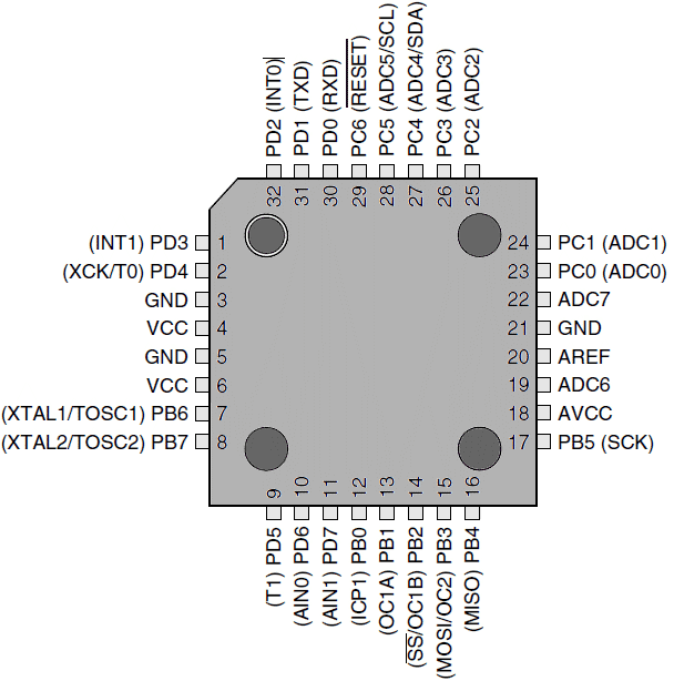 Jeśli zostanie zaprogramowany bit bezpiecznikowy RSTDISBL, to końcówka PC6 staje się końcówką we/wy. Zauważ jednak, iż jej parametry elektryczne różnią się od parametrów pozostałych końcówek portu C.