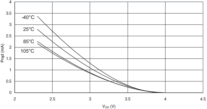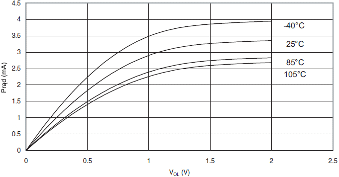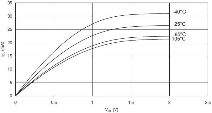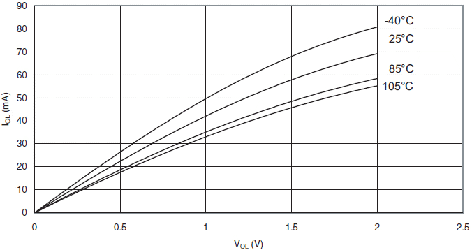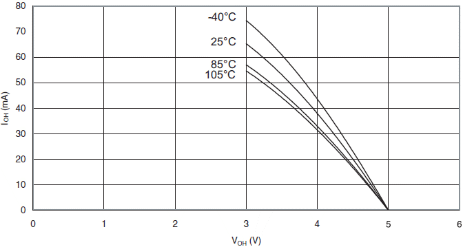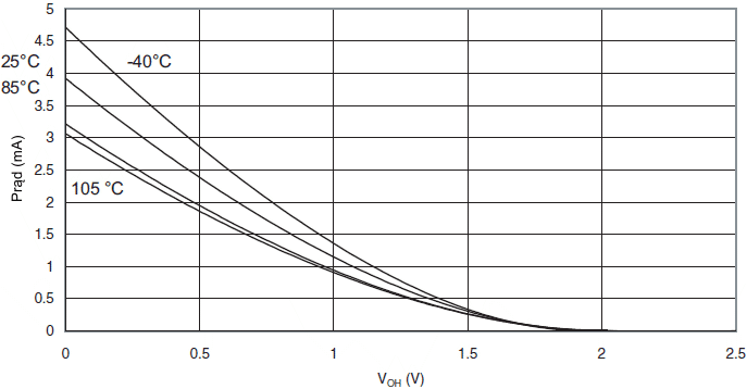 Prąd wypływający z końcówki we/wy w funkcji napięcia wyjściowego