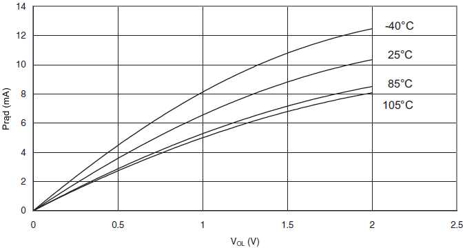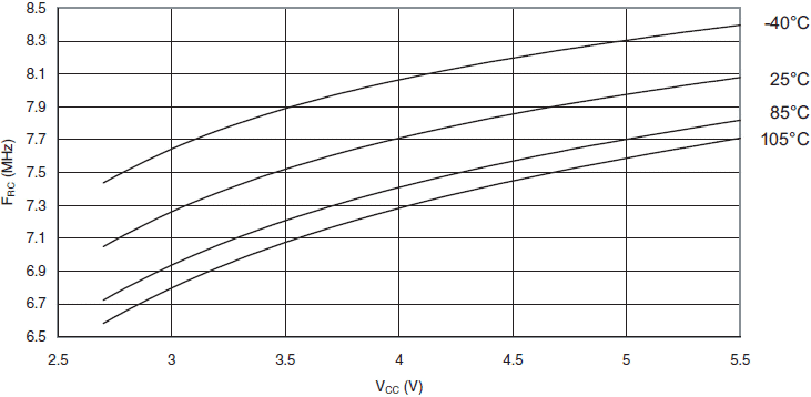 Poniższe wykresy ukazują typowe zachowanie się mikrokontrolera. Danych tych nie testowano podczas produkcji. Wszystkie pomiary poboru prądu dokonano przy wszystkich końcówkach we/wy skonfigurowanych jako wejścia z włączonymi wewnętrznymi opornikami podciągającymi. Jako źródło zegarowe użyto generatora sinusoidalnego z wyjściem typu rail-to-rail.