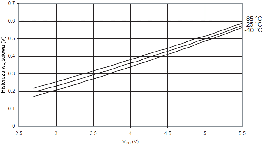 Histereza wejściowa końcówki we/wy w funkcji napięcia zasilającego VCC