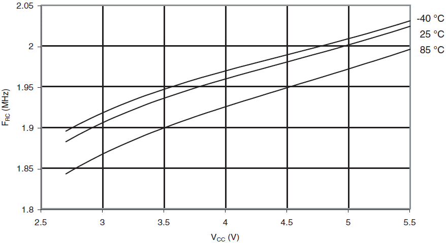 Częstotliwość kalibrowanego oscylatora RC 2MHz w funkcji VCC