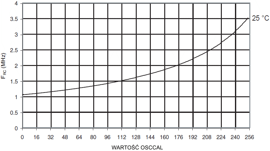 Częstotliwość kalibrowanego oscylatora RC 2MHz w funkcji wartości rejestru