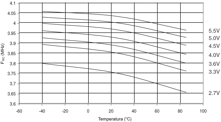 Częstotliwość kalibrowanego oscylatora RC 4MHz w funkcji temperatury