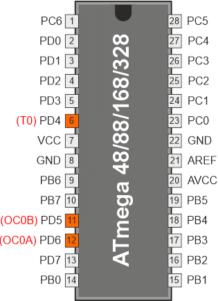 Ustawienie bitów COM0x1:0 na 2 utworzy nieodwrócony przebieg PWM, a odwrócony przebieg PWM może zostać wygenerowany przez ustawienie bitów COM0x1:0 na 3: ustawienie bitów COM0A1:0 na 1 umożliwia zmianę stanu końcówki OC0A przy zgodnościach porównań, jeśli jest ustawiony bit WGM02. Opcja ta jest niedostępna dla końcówki OC0B. Faktyczna wartość OC0x pojawi się na końcówce portu tylko wtedy, gdy końcówka ta zostanie ustawiona jako wyjście. Przebieg PWM jest generowany przez ustawianie (lub zerowanie) rejestru OC0x przy zgodności porównania pomiędzy OCR0x i TCNT0, a zerowanie (lub ustawianie) rejestru OC0x w cyklu zegara timera, w którym licznik jest zerowany (zmienia wartość z TOP na BOTTOM).