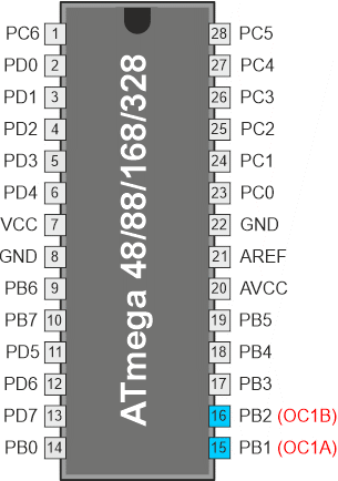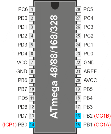 Końcówki portów współpracujące z timerem/licznikiem 1 w mikrokontrolerze ATmega48A/PA/88A/PA/168A/PA/328/P są następujące: