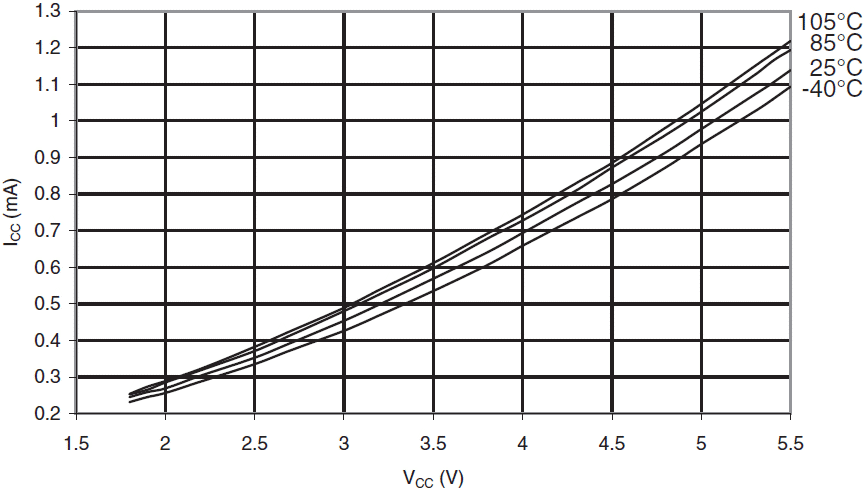 Rys.88 ATmega48PA: Prąd komparatora analogowego w funkcji VCC