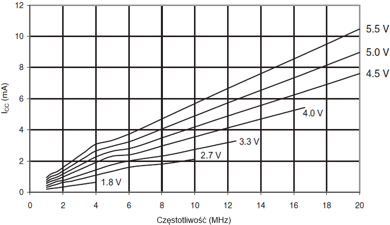 ![]() gdzie: CL = obciążająca pojemność VCC = napięcie robocze f = średnia częstotliwość przełączania końcówki we/wy |