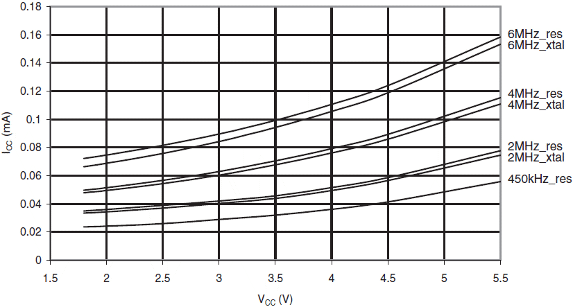 Poniższe wykresy ukazują typowe zachowanie się mikrokontrolera. Danych tych nie testowano podczas produkcji. Wszystkie pomiary poboru prądu dokonano przy wszystkich końcówkach we/wy skonfigurowanych jako wejścia z włączonymi wewnętrznymi opornikami podciągającymi. Jako źródło zegarowe użyto generatora sinusoidalnego z wyjściem typu rail-to-rail.