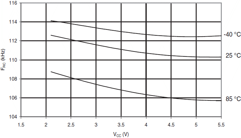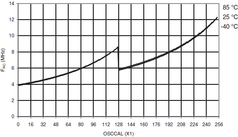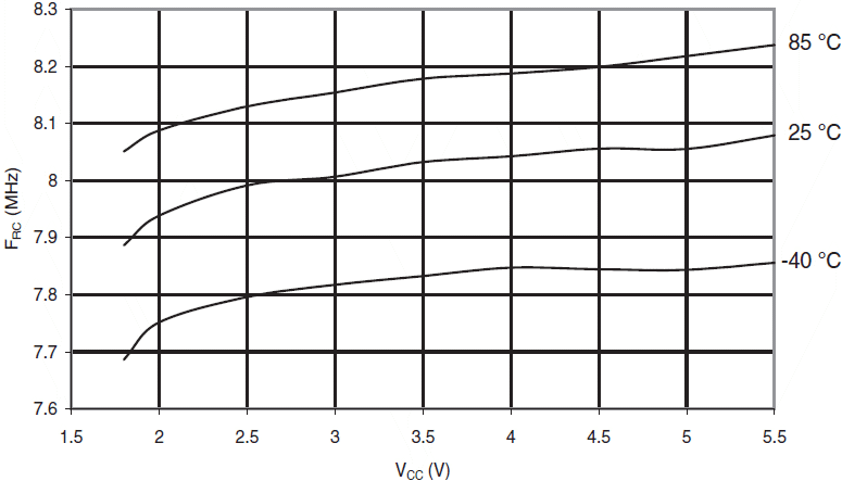 Rys.133 ATmega88A: Częstotliwość kalibrowanego oscylatora RC