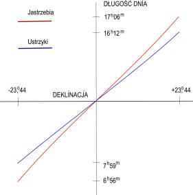 - Dla Ustrzyk długość dnia w dniu przesilenia letniego 16h12m (rachunek daje - 16h11m), dla Jastrzębiej - 17h4m (rachunek - 17h20m).