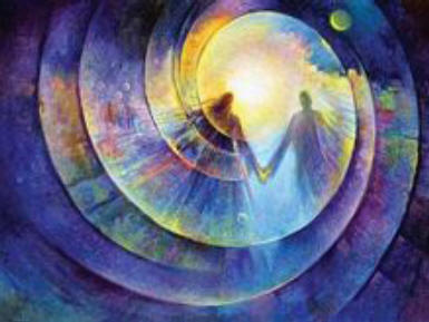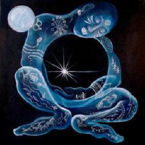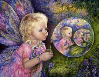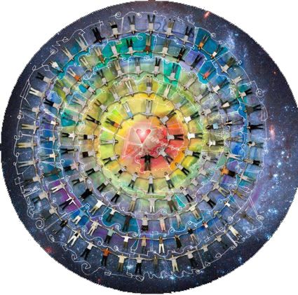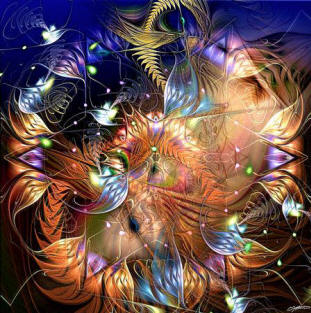 Kaj korbopleno da multkoloraj birdetoj estis jam fluganta meze de neforgesebla kvivitado ĉirkaŭ la serena vizaĝo de Natalia, kaj lanugaj katidoj ruliĝis inter la hufoj de la ĉevalo de Silvana, supren- kaj malsupren-saltis en fola ludado de ŝiaj bonvenigaj brakoj al la planko kaj ree al ŝiaj brakoj, dum hundoj petolemaj stare ekvilibriĝis por donaci al ridetanta Ĵanaina ĉu ŝtonetojn, ĉu branĉpecojn, kiuj ĉiumomente falis el ilia dentopremo, tiel ke konstante ili ronde kuradis ĉirkaŭ la ĉevalo por preni novan donaceton, kaj eĉ ne ĉesis kiam ĉe la akvosurfaco aperis senfinaj movantaj cirkloj ekzakte tie, kie fiŝoj surnaĝis por rigardtanĝi plej kortuŝe la feliĉan trankvilecon de Arabela, kaj kiam florforma nubo da brilzumantaj abeloj elverŝiĝissuper Roksana por fari al ŝi teneregan ho-noron... Ŝarazado ek-stamfis, ŝi karesis ĝian krinaron ; kaj sammomente la ĉevalo ekpaŝis, baldaŭ delikat-ege plaŭdis antaŭen en la rivero, kaj splitgutetoj aspergis la akvon por ĝin transformi en travideblan kristalspegulon, sur kiu liniiĝis la ses virinoj, kiuj tiam ekvidis... ilin, eble ĉe la alia bordo, eble ene de la rojo, meze de glimoj splendoraj... kaj komencis tiam la kavalkado... de spegulo al spegulo, ĉar estis spegulaj septoj inter ĉiuj el ili, ĉies bildo multobliĝis ĝis sep, kaj la sep bildoj de ĉiuj el ili respeguliĝis kune, surmetite, interfandiĝe, sur ununura diafana kaj infinita spegulo, sezamo de universala unuiĝo, kie ĉiu havis sian bildon, kie ĉiuj amoj kunmiksiĝis, kompletigis sin, radiadis senbride, per larĝa, tuttera propagiĝ-turniĝado...