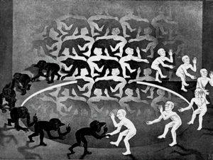 — Karegaj, sufiĉas krucosigni por pruvi al la demono vian sanktecon kaj plu iri en paco. Aŭ ĉu vi estas ĉiuj herezulinoj?