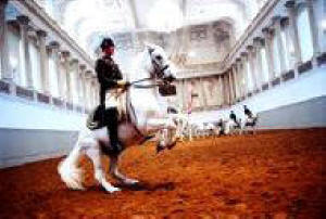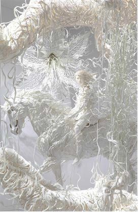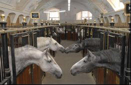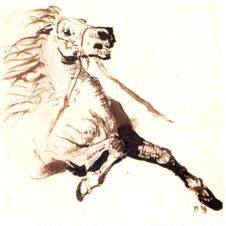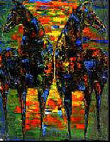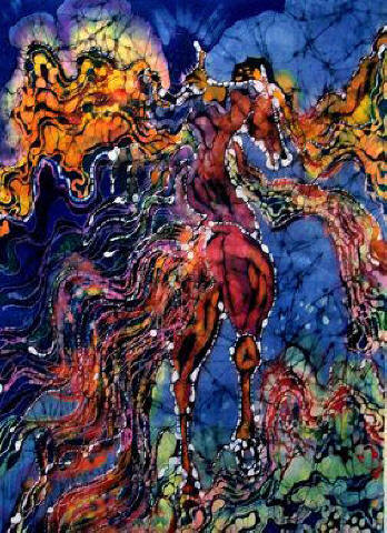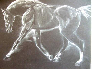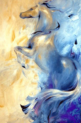 La ĉevaloj majeste ekpaŝis, orgojle ekis artisman trotadon kaj fine agordis galopadon laŭ plej rafinita koreografio. La blanka, beja kaj nigra paroj kuris tiom elegante kaj ventleĝere, ke samsekunde ili antaŭenflugis en l’aeron, dum momenteto iĝis pegazoj detranĉitaj de riĉaj mitologi-bildoj, emis kunfandiĝi en la poezion de la senlima kosmo, sed subite konsciis pri siaj rajdantoj, sentis ties admiron kaj agnoskon pri la reĝa supereco de la rajdbestoj, kaj decidis renovigi ĉies ĝojkulminon per ege malpeza refalo surteren, preskaŭ fulmrapida ripozo por plia impulso-preno kaj nova rava levitacio. Jungaĵoj brilantaj de multkoloraj juveloj, surkapaj plumoj pompe portitaj kaj blindige blankaj, ĉio, ĉio disĵetis neforgeseblajn glazurajn ŝanĝbrilojn.