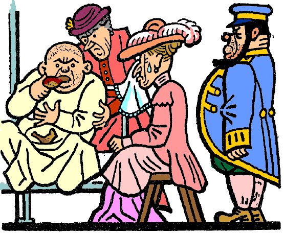 ”Soldatoj,” li komencis, ”se vi havus iom da prudento, vi lasus ĉion kuŝi kaj dirus al vi, ke se ni tion forvoros, sinjoro ĉefkuracisto al ni ne kredos, ke ni estas grave malsanaj. Per tio vi donis pruvon al vi mem, ke vi ne pritaksas mian bonkorecon. Mi elpumpas al vi la stomakojn, donas al vi klisterojn, klopodas teni vin ĉe absoluta dieto, kaj vi troŝtopas la stomakon. Ĉu vi volas ricevi intestan kataron? Vi eraras, antaŭ ol via stomako provos tion digesti, mi purigos ĝin al vi tiel funde, ke vi rememoros tion ĝis la plej fora morto kaj rakontos ankoraŭ al viaj infanoj, kiel foje vi forvoris kokidojn kaj ŝtopiĝis per diversaj aliaj bongustaĵoj, sed kiel tio ne eltenis al vi en la stomako eĉ kvaronhoron, ĉar senpere post tio oni ĝin al vi elpumpis. Kaj tiel sekvu min unu post alia, por ke vi ne forgesu, ke mi estas ne idioto kiel vi, sed tamen nur iom pli saĝa ol vi ĉiuj kune. Krom tio mi al vi anoncas, ke morgaŭ mi sendos ĉi tien al vi komisionon, ĉar vi maldiligentaĉas ĉi tie jam tro longe kaj neniu el vi je io suferas, se dum tiuj kvin minutoj vi povas malpurigi al vi la stomakon tiel 'bele', kiel vi pruvis tion ĝuste nun. Do, marŝ'!”