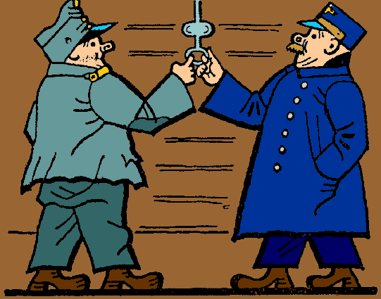 Švejk leviĝis kaj kun la fervojisto alpaŝis al la alarmbremso ”En danĝero”.