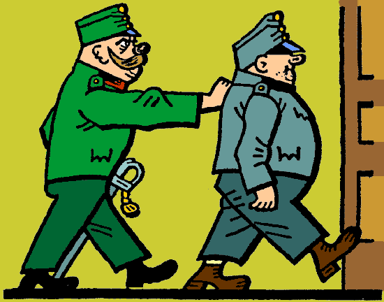 La majoro pugnobatis la tablon kaj alkriegis la ĉefserĝenton: ”Inerta ulo, jam milfoje mi al vi diris, ke viaj soldatoj estas surfekita bando de porkinoj.” Turnante sin al la timkonfuzita viraro, li kriis: ”Soldatoj! El viaj okuloj rigardas idioteco, eĉ se vi dormas, kaj kiam vi vekiĝos, vi mienas, uloj, kvazaŭ ĉiu el vi forvorus vagonon da dinamito.”