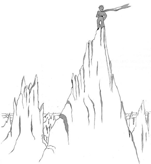 La eta princo suprengrimpis sur alta monto. La solaj montoj, kiujn li iam konis, estis la tri vulkanoj, kies supro atingas la altecon de liaj genuoj. Kaj li uzis la estingitan vulkanon kiel tabureton. ”Supre, sur monto alta kiel tiu ĉi,” li pensis, ”mi per unu sola rigardo ekvidos la tutan planedon kaj ĉiujn homojn…” Sed li ekvidis nenion alian ol pintecan rokaron.