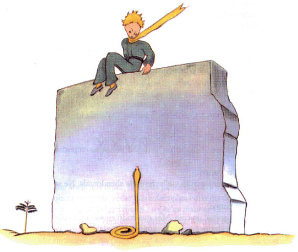 Tie estis, leviĝanta kontraŭ la eta princo, unu el tiuj flavaj serpentoj, kiuj ekzekutas vin en tridek sekundoj. Penante elpoŝigi mian revolveron, mi ekkuris, sed, aŭdante la bruon, la serpento lasis sin malrapide glitfali en la sablon kiel malaperanta fonto kaj, ne tro rapide, traŝoviĝis kun metala susuro inter ŝtonoj.