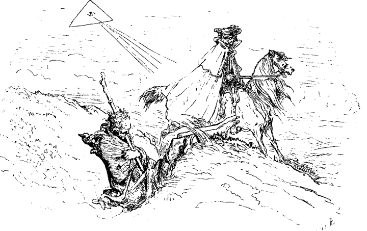 Post mallonga pripenso mi prenis unu el miaj pistoloj, dispafis la bridon, malsuprenigis la ĉevalon kaj daŭrigis mian vojaĝon.