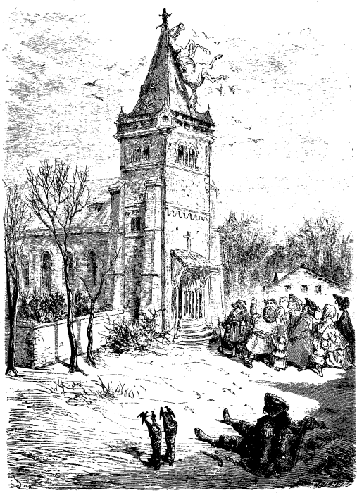 Lacigita mi elseliĝis kaj alligis mian ĉevalon al io simila al pinta stumpo de arbo, elstaranta el neĝo. Por defendo mi metis miajn pistolojn sub mian brakon kaj kuŝigis min sur la neĝo, kie mi dormis tiel bone, ke mi ne malfermis miajn okulojn ĝis plena taglumo. Ne estas facile kompreni mian miregon, kiam mi trovis min kuŝanta en tombejo meze de vilaĝo; kaj mia ĉevalo ne estis videbla, sed tuj poste mi aŭdis ĝin blekanta ie super mi. Rigardante supren, mi ekvidis ĝin pendanta per la brido ĉe la ventoflago de la turo. La afero nun klariĝis al mi: en la vespero la vilaĝo estis kovrita de neĝo; subita ŝanĝo de vetero okazis; mi malsupreniĝis al la tombejo dum la dormo, malrapide kaj nesenteble, dum la neĝo degelis; kaj tio, kion mi konsideris en la mallumo kiel stumpon de malgranda arbo, kiu elstaris super la neĝo kaj al kiu mi alligis mian ĉevalon, efektive estis la kruco aŭ la ventoflago de la preĝeja turo!