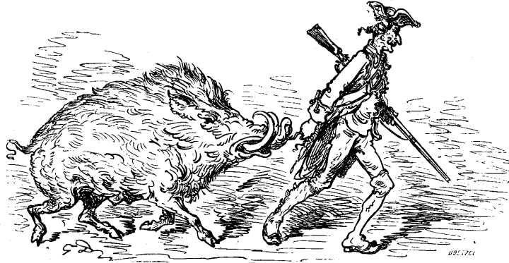 Okazo kaj bonŝanco ofte korektas niajn erarojn; por tio mi havis strangan ekzemplon tuj poste, kiam en la profundo de iu arbaro mi vidis sovaĝajn porkon kaj porkinon, kurantajn proksime unu post la alia. Mia kuglo maltrafis ilin, tamen nur la antaŭa porko forkuris, sed la porkino ekstaris senmove, kvazaŭ fiksita al la tero. Ekzamenante la aferon, mi trovis, ke la besto estas tre maljuna porkino, blinda pro maljuneco. Ĝi kutimis buŝteni la voston de sia ido, por esti kondukata laŭ fila devo. Mia kuglo trafis la voston kaj distranĉis ĝin, sed la maljunulino daŭre tenis la restintan parton en sia buŝo, kaj ĉar ĝia antaŭa gvidanto ne plu tiris ĝin, ĝi kompreneble haltis.