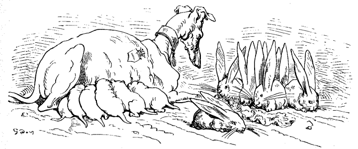 Alproksimiĝante mi spertis grandan surprizon. La leporo naskis dum la kurado; la samo okazis al mia hundino dum la ĉasado, kaj estis precize tiom da leporidoj kiom da hundidoj.