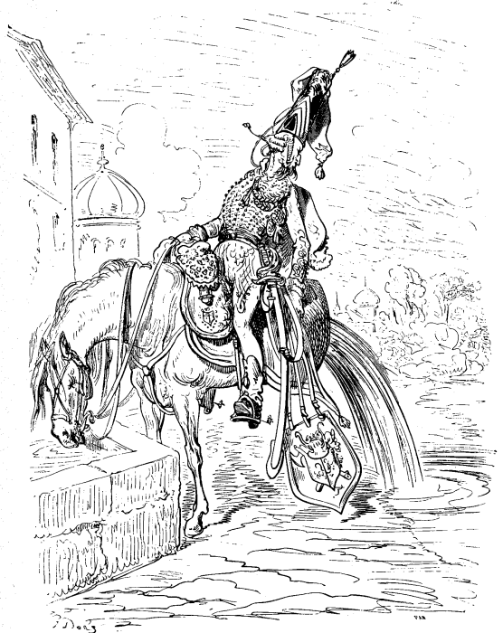 Ĉu ili trasercas la aliajn stratojn, aŭ kio okazis al ili? ili ne povas esti malproksime kaj certe baldaŭ alvenos. – En tiu atendado mi trotigis mian spiregantan litovan ĉevalon al fonto sur la placo kaj lasis ĝin trinki. Ĝi trinkis pli ol ordinare kaj kun avideco ne kontentigebla; tamen tio estis tute natura: rigardante ĉirkaŭen por trovi miajn soldatojn, kion mi ekvidis, sinjoroj? La malantaŭa parto de la kompatinda kreitaĵo – gluteo kaj kruroj – mankis, kvazaŭ la ĉevalo estus distranĉita en du pecojn, kaj la akvo elfluis, kiel ĝi eniris, ne refreŝigante la beston, nek farante al ĝi ion bonan! Kiel tio povis okazi, estis por mi tuta mistero, ĝis kiam mi revenis kun la ĉevalo al la urba pordego. Tie mi vidis, ke kiam mi enkuregis rapidege post la forkuranta malamiko, oni malsuprenigis la pordokulison (peza falpordo kun akraj pintegoj ĉe la malsupraĵo, kiun oni faligas subite por malebligi al malamiko eniron en fortikigitan urbon) ne vidatan de mi, kaj ĝi tute detranĉis la malantaŭan parton de mia ĉevalo, kaj tiu parto ankoraŭ kuŝis tremetante ekster la pordego. Tio estus por mi neriparebla perdo, se la hufferaĵisto ne sukcesus kunigi ambaŭ partojn, dum ili ankoraŭ estis varmaj.