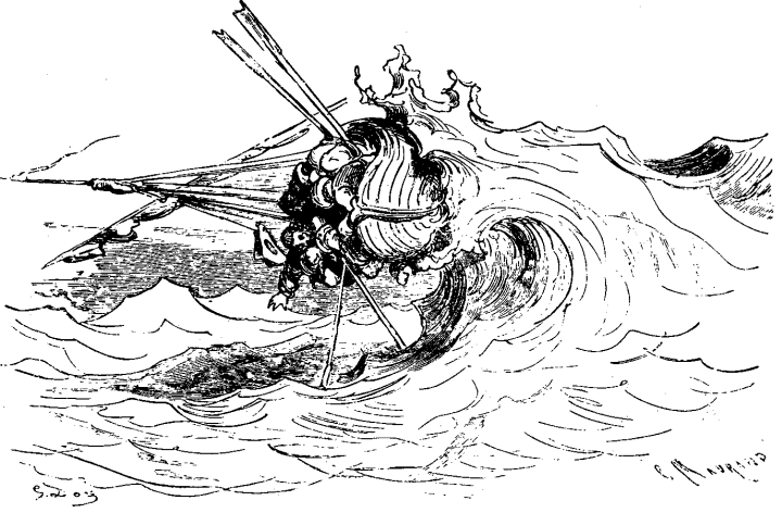 Je ĉirkaŭ la oka aŭ naŭa horo, tiel proksimume, kiel mi povis juĝi laŭ alteco de la suno, la vento subite leviĝis kaj klinis mian barkon unuflanken; nun ĝi pleniĝis de akvo, kaj mi ne vidis ĝin dum kelka tempo. Feliĉe ni ĉiuj savis nin (ses viroj kaj du knaboj), tenante firme la arbon, kies branĉoj estis sufiĉe fortikaj por nia pezo, sed ne por la pezo de la barko. En tiu situacio ni restis ses semajnojn kaj tri tagojn, nutrante nin per la migdaloj; mi ne bezonas informi vin, ke ni havis sufiĉegon da akvo. En la kvardekdua tago de nia malfeliĉo la akvo malleviĝis tiel rapide, kiel ĝi leviĝis, kaj en la kvardeksesa ni povis meti niajn piedojn sur la firman teron.