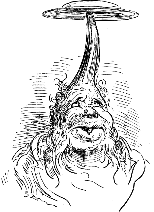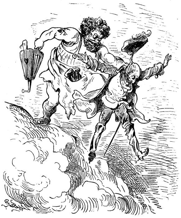 Mi promenis ĉirkaŭ la rando de la kratero, kiu ŝajnis almenaŭ kvindekoble pli ampleksa ol la Diabla Punĉo-Pelvo apud Petersfield, ĉe la vojo al Portsmouth, sed ne tiel vasta en la fundo, ĉar en tiu parto ĝi pli similas la mallarĝan parton de funelo, ol punĉo-pelvon. Fine, decidinte, mi ensaltis kun la piedoj antaŭe; mi tuj trovis min en varma loko, kaj mia korpo estis kontuzata kaj bruligata en diversaj partoj de la ruĝe varmegaj cindroj, kiuj en furioza supreniro kontraŭis mian malsupreniron; tamen mia pezo baldaŭ portis min al la malsupraĵo, kie mi trovis min meze de bruado, miksita kun plej teruraj malbenadoj; rekonsciiĝinte kaj sentante malpliigon de miaj doloroj, mi komencis ĉirkaŭrigardi. Imagu, sinjoroj, mian surprizon, kiam mi trovis min en kunesto de Vulkano kaj liaj Ciklopoj, kiuj dum la lastaj tri semajnoj, menciitaj antaŭe, malpaciĝis pri konservado de bonordo kaj konvena disciplino, kaj tio kaŭzis tian alarmegon dum tiu tempo en la supra mondo.