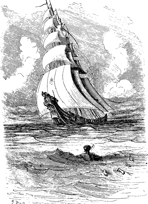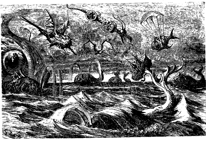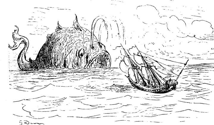 Gustumante la akvon, ni trovis, ke ĝi estas bonega vino, kaj kun granda malfacilo ni detenis la maristojn de ebriiĝo. Post kelkaj horoj ni trovis nin ĉirkaŭataj de balenoj kaj aliaj grandegaj bestoj; unu el ili ŝajnis tiel granda, ke okulo ne povis formi juĝon pri ĝi; ni ne vidis ĝin antaŭ nia alproksimiĝo. Ĉi tiu monstro tiris nian ŝipon, kun ĉiuj ĝiaj starantaj mastoj kaj veloj levitaj, per unu ensuĉo en sian buŝegon, inter siajn dentojn, kiuj estis multe pli grandaj kaj multe pli altaj ol la mastoj de unuaklasa batalŝipo. Kiam ni jam estis en ĝia buŝego kelkan tempon, ĝi malfermis ĝin sufiĉe vaste, enprenis grandegan kvanton da akvo kaj drivigis nian ŝipon, kiu havis minimume la ŝargamplekson de kvincent tunoj, en sian stomakon; tie ni kuŝis tiel kviete kiel ankrite en plena senventeco.