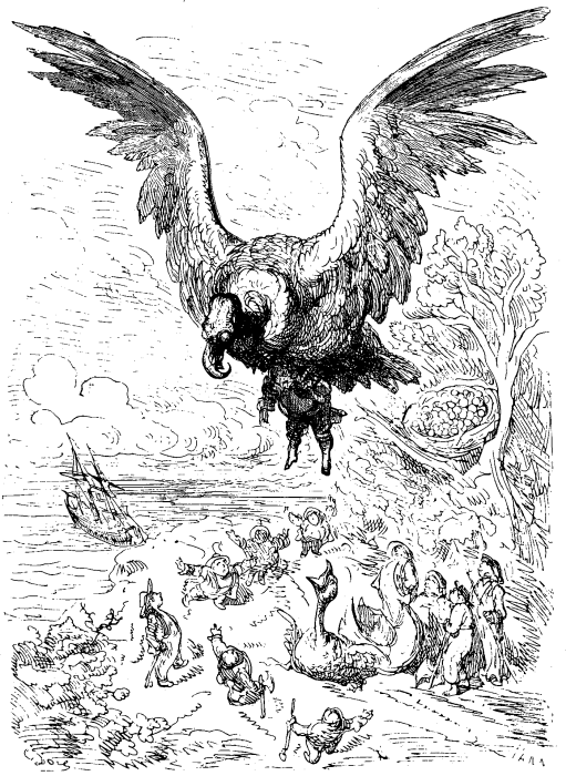 Tranĉe malferminte kun granda peno unu el tiuj ovoj, ni ellasis ideton senpluman, multe pli grandan ol dudek plenkreskaj vulturoj. Ĝuste kiam mi donis al tiu junulo la liberecon, la maljuna alciono alvenis, kaj ekkaptante per unu el siaj ungegoj nian kapitanon, kiu sin okupis pri la rompado de la ovo, forflugis kun li pli ol mejlon alten; poste ĝi lasis lin fali en la maron, elbatinte ĉiujn liajn dentojn per siaj flugiloj.