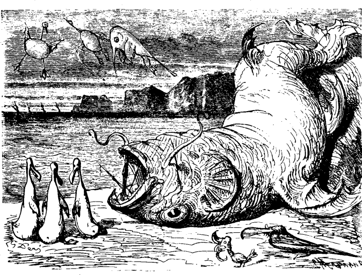 Dufoje ĉiutage ni ĉiuj estis drivantaj kaj surfundiĝantaj; kiam ajn ĝi trinkis, fariĝis por ni tajdalfluo; kaj kiam ĝi ekskreciis, ni trovis nin surfunde; laŭ modera kalkulo ĝi enprenis pli multe da akvo per unu sola engluto, ol oni ordinare trovas en la lago de Ĝenevo, kvankam tiu lago havas periferion de pli ol tridek mejloj. En la dua tago de mallibereco en tiuj regionoj de mallumo, ni dum malalta tajdo kuraĝis vagadi kun la ŝipestro kaj kelkaj oficiroj, kun torĉoj en niaj manoj. Ni renkontis homojn el ĉiuj nacioj, en la nombro de pli ol dek mi!; ili volis interkonsiliĝi pri tio, kiel reliberiĝi. Kelkaj el ili jam loĝis en la stomako de tiu besto kelkajn jarojn; estis ĉi tie kelkaj infanoj, kiuj neniam vidis la mondon, iliaj patrinoj akuŝis kelkajn fojojn en tiu varma situacio. Ĝuste kiam la prezidanto volis informi nin pri la motivo de la kunveno, tiu malbenita fiŝo, fariĝinte soifa, ektrinkis en sia kutima maniero; la akvo enverŝigis tiel rapide, ke ni ĉiuj tuj estis devigataj retiri nin al niaj respektivaj ŝipoj aŭ riski dronon; kelkaj devis naĝi kaj kun malfacileco savis sian vivon. Post kelkaj horoj ni estis pli feliĉaj, ni interrenkontis denove, kiam la monstro ĵus malplenigis sin. Mi, estis elektita prezidanto, kaj mia unua ago estis proponi, ke ni kunligu du ĉefmastojn, kaj kiam la fiŝo malfermos sian buŝegon la proksiman fojon, starigu la mastojn tiel, ke ĝi ne povos fermi la buŝegon. Tiu propono estis unuanime aprobita. Cent fortaj viroj estis elektitaj por tiu tasko. Apenaŭ ni estis preparintaj niajn mastojn, sin prezentis oportuna okazo: la monstro malfermis sian buŝegon, oni tuj metis la supraĵon de la masto sub la palaton, kaj la alia fino traboris la langon; la operacio efike malebligis al la monstro fermi la buŝegon. Tuj kiam ĉio en ĝia stomako drivis denove, ni prenis kelkajn boatojn kaj remis nin for en la mondon.