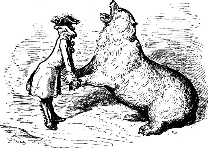 Unu el la indiĝenoj de la fromaĝa insulo, kiun mi kunvenigis, klarigis ĝin jene: ke la monstro, en kies stomako ni estis malliberigitaj, portis nin ĉi tien tra iu subtera koridoro. Ni remis al la bordo, kaj mi estis la unua, kiu surteriĝis. Ĝuste kiam mi metis mian piedon sur la teron, granda urso saltis sur min per siaj antaŭaj piedegoj. Mi ekkaptis po unu piedego per ĉiu mano kaj premegis ilin, ĝis kiam la urso blekis tre laŭte; en tiu pozicio mi tenis ĝin, ĝis kiam ĝi mortis pro malsato. Eble vi ridos, sinjoroj, sed mi sukcesis en tio, ĉar mi malebligis al ĝi leki siajn piedegojn.