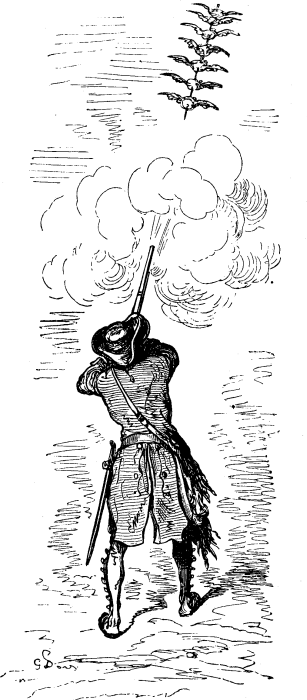 Kiam aro da perdrikoj estas maltrankviligitaj en tiu maniero per butono falanta inter ilin, ili ĉiam leviĝas de la tero en rekta linio unu post la alia. Iun tagon, forgesinte elpreni la premstangon el mia pafilo, mi elpafis ĝin rekte tra vico da perdrikoj, tiel regule, kvazaŭ la kuiristo estus trapikinta ilin.