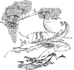 Egesiĥora kun facila teruro rigardadis en malhel-bluajn kavojn inter ondoj, penante imagi al si teruran, de neniu mezuritan profundon de la mara abismo. Tais kelkfoje ruzete rigardis al la amikino, kiu suferis pro la humida varmego kaj perdis sian ordinaran aspekton de venka diino. Sur la ferdeko sub markezo kaj en la holdo sur provizaĵoj de manĝo kaj armiloj pigre ekkuŝis homoj. La pli fortikaj aŭ pli malpaciencaj staris, apoginte sin al salikaj plektaĵoj super la ŝipflankoj, kaj penis trovi malvarmeton en blovo de la libia Notoso, sub kies facila premo la ŝipoj estis apenaŭ rimarkeble retiriĝantaj norden.