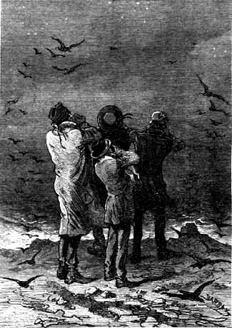 Estis ĉirkaŭ la sesa; la nebulo leviĝis super la oceano kaj la nokto fariĝis pli malhela. La rompiĝuloj ekvagis laŭ la norda bordo de tute nekonata lando, al kiu la sorto ilin ĵetis. Sub iliaj piedoj estis sabla grundo miksita kun ŝtonetoj kaj ŝajne sen ia vegetaĵaro. La grundo, tre malebena kaj malglata, estis rompita tie ĉi kaj tie per malgrandaj disfendoj, kiuj ege malfaciligis la progreson. Ĉiumomente el tiuj fendoj elsaltis iuj grandaj, peze flugantaj birdoj. La mallumo malebligis ilin rekoni. Aliaj, pli rapidaj kaj pli malgrandaj, ekflugis en aroj kiel nuboj. Al la maristo ŝajnis, ke li rekonas ilin kiel mevojn kaj pli malgrandajn marbirdojn, kies terure akraj krioj sufokis eĉ la bruon de la ondoj.